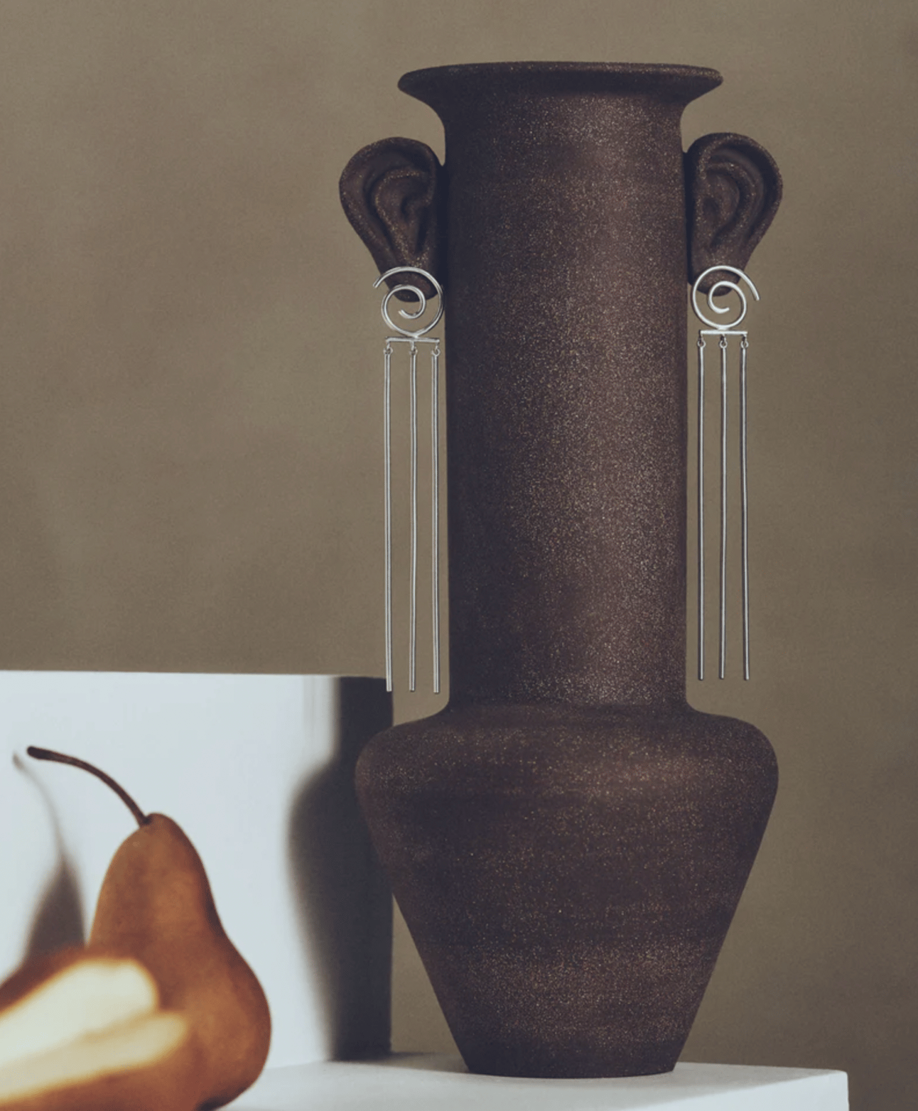 The collaboration between ceramist Steph Trowbridge and jeweler Natalie Joy creates a beautiful mix of textures and materials—including brown stoneware, detailed hand-sculpted pieces, and silver accents.