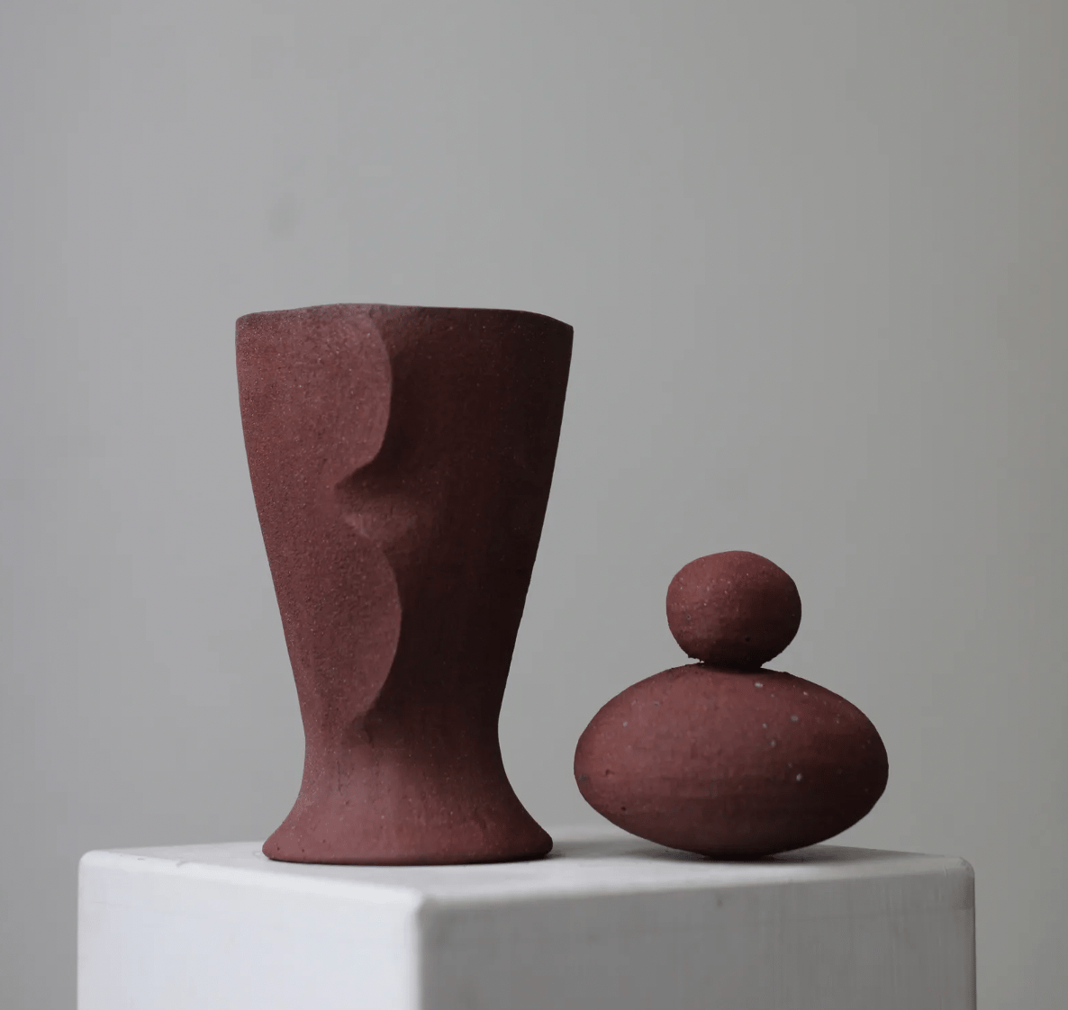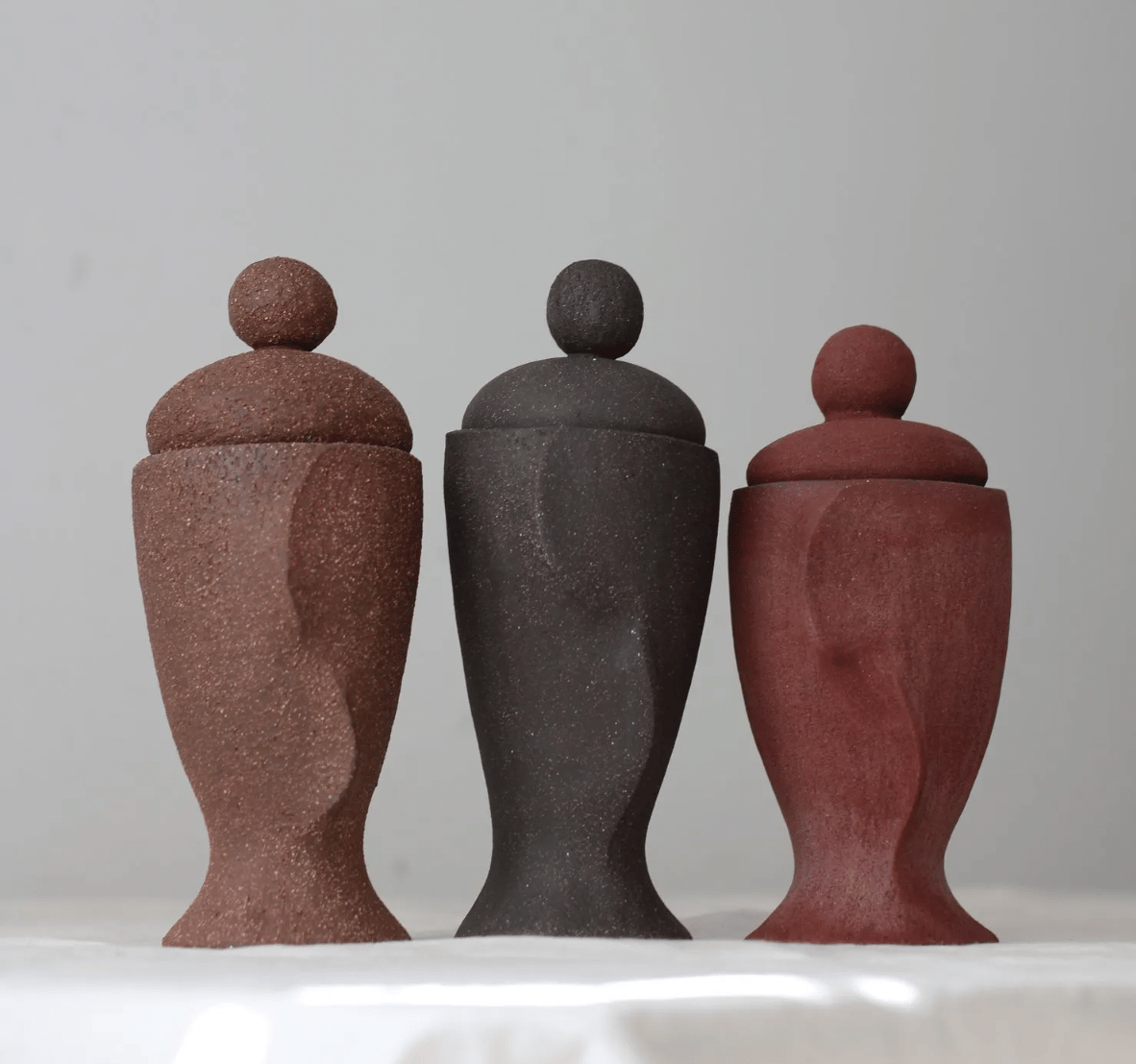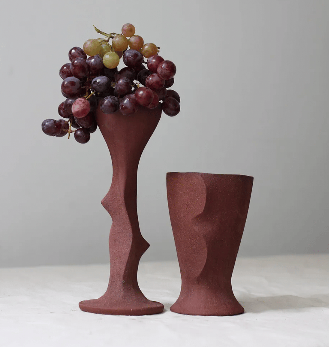 The vessels, made of red stoneware ceramic, come in three different designs, each featuring organic, sculptural shapes that reflect the movement and forms found in nature. The pieces serve as both scented candle holders and functional goblets or bowls once the wax is consumed.