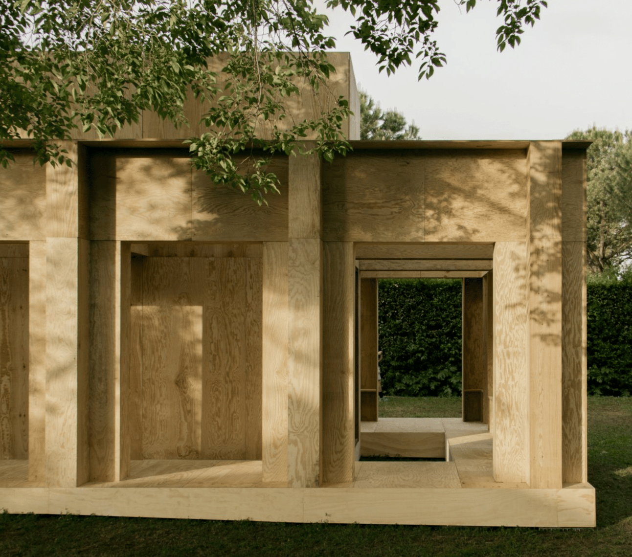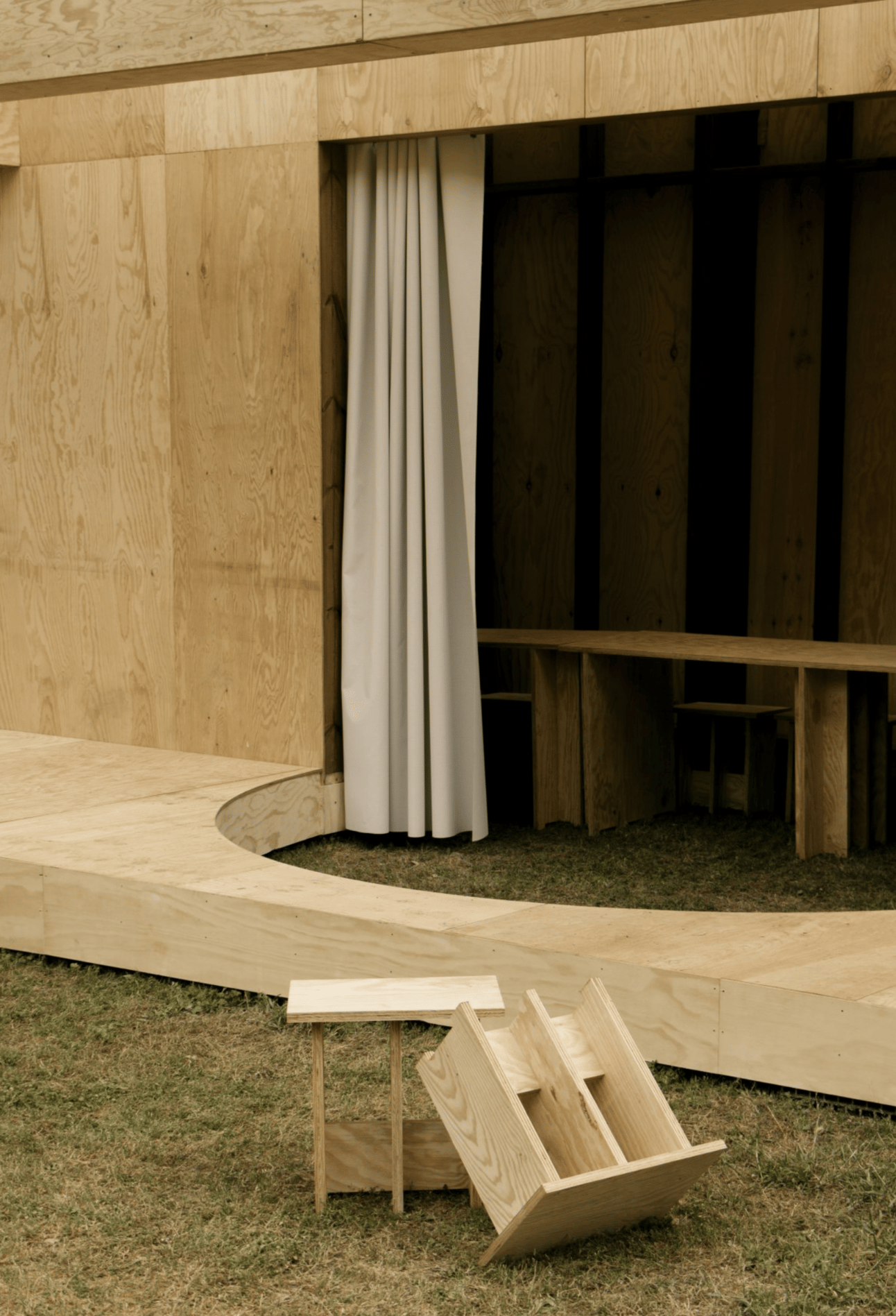 Constructed entirely from maritime pine plywood sourced from the Landes region, the structure uses a simple yet effective notching system to join its components. This approach allowed the structure to be assembled quickly and efficiently on site. Beyond design, the architects took on the role of builders, collaborating with three carpenters—an act of shared creativity and hands-on realization.