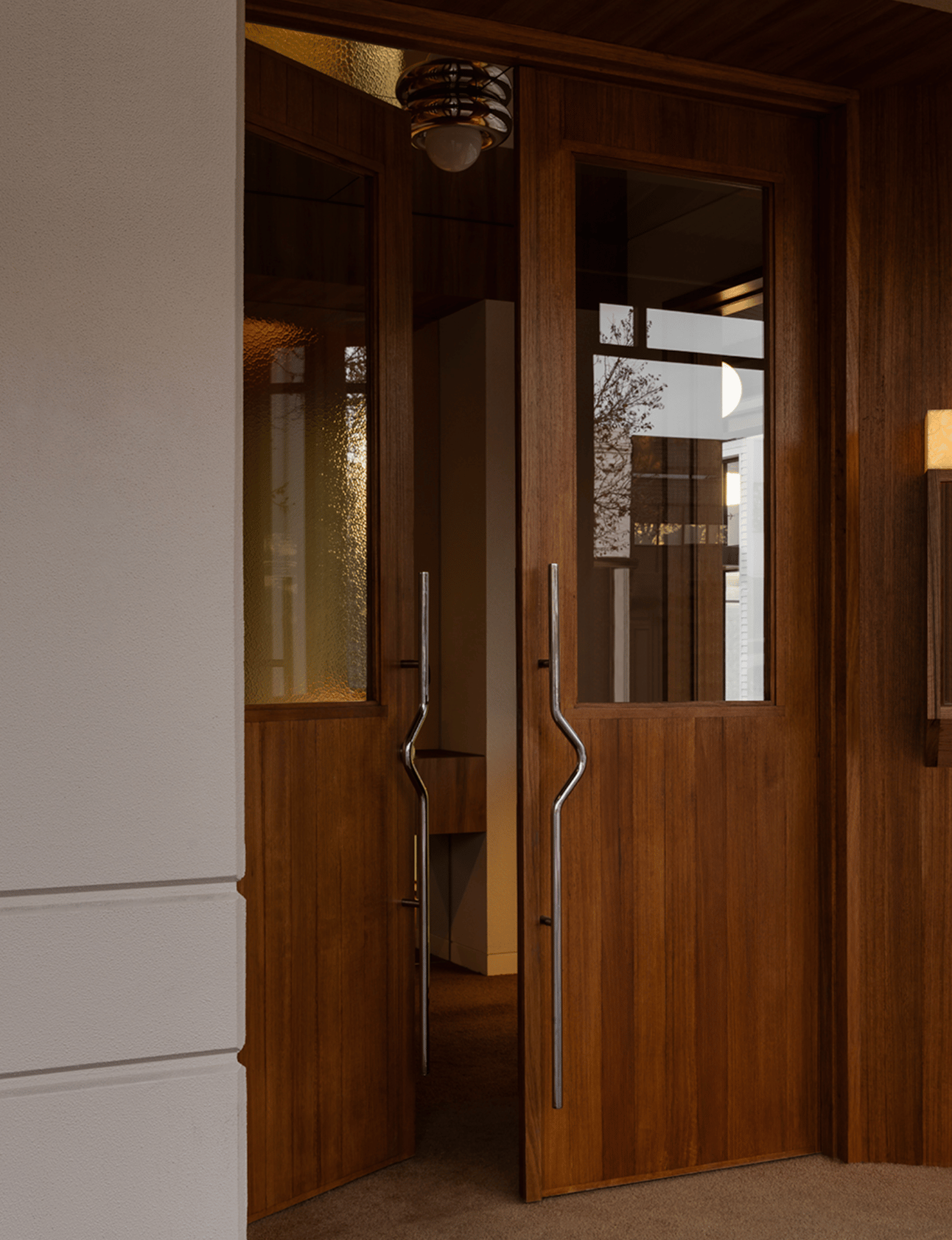 The combination of concrete floors, sloping walls, chrome, leather, and wood materials creates a dynamic, tactile experience. Custom-made furniture and yellow stained glass add warmth and color, transforming the space as the day transitions from sunlight to evening.