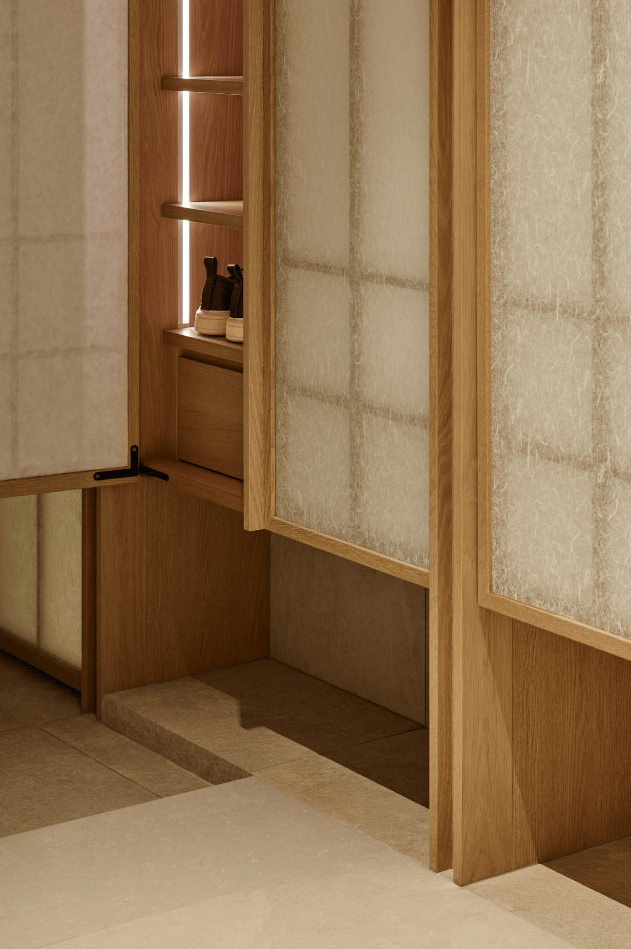 Untreated wood, matte stone, and handcrafted terracotta—all chosen for their texturized richness and organic presence. Sliding bamboo-woven doors create fluid transitions between rooms and offer both visual openness and flexible boundaries.