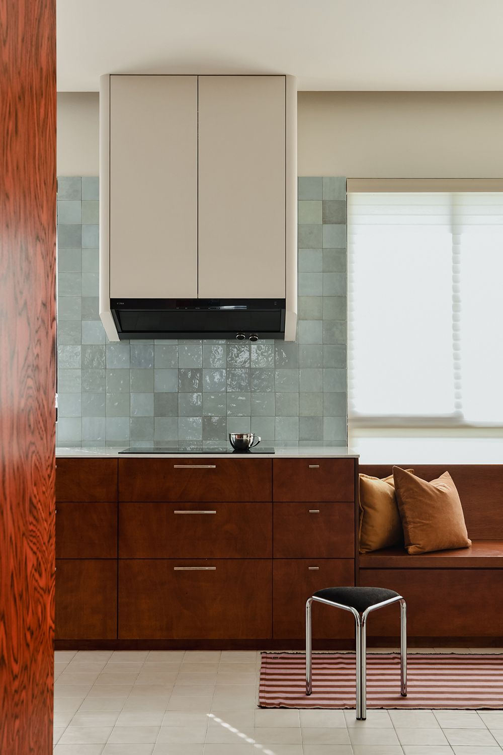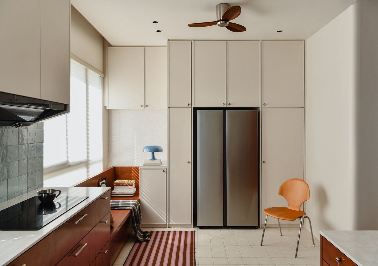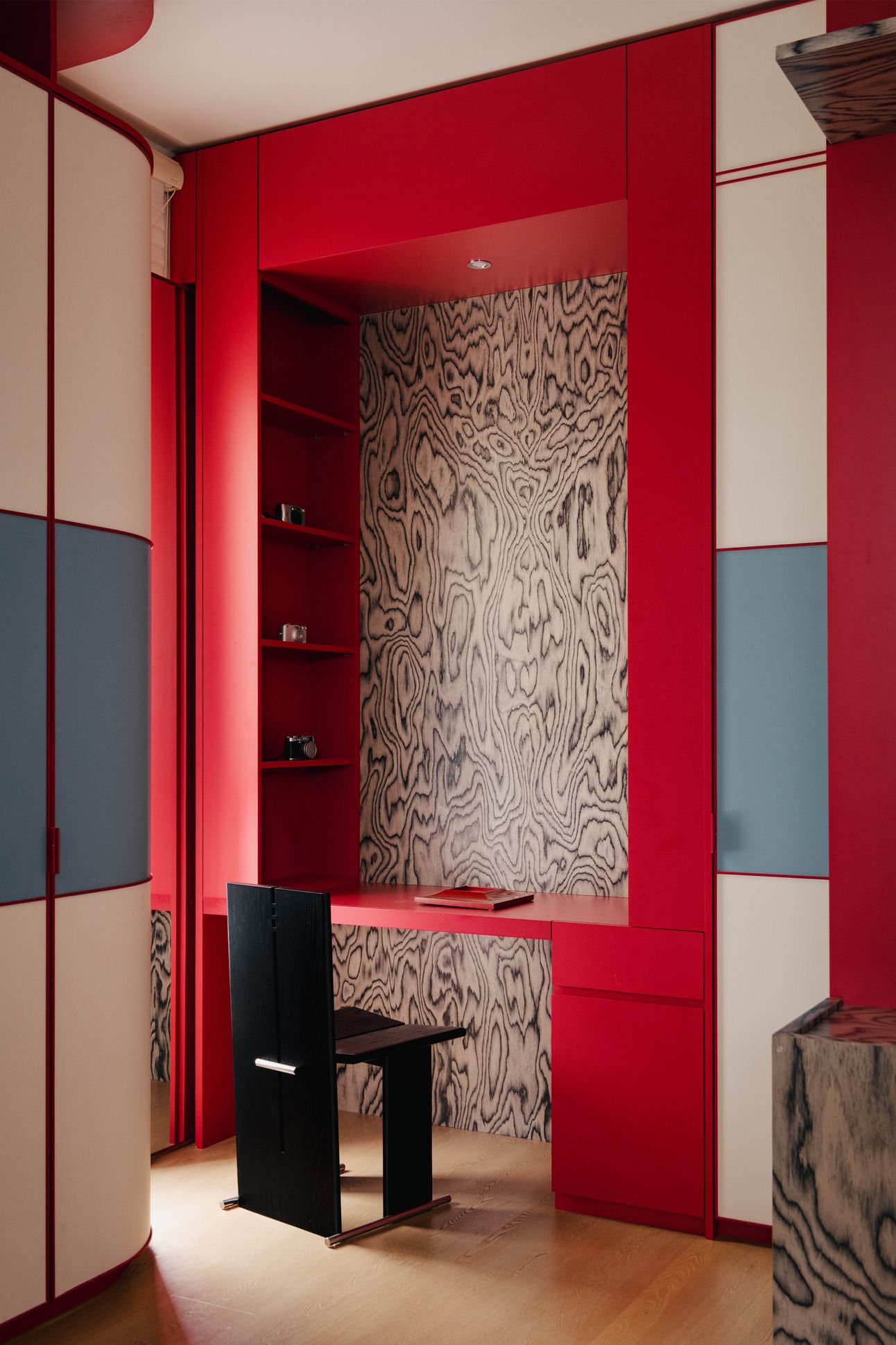 The design draws from mid-century modernism, not as nostalgia, but as a design language with enduring relevance. Primary colors, graphic contrasts, and material texture are used with precision—from red-stained ply to ALPI veneer and stainless steel. Each element contributes to a bold yet grounded atmosphere, tailored for contemporary life.