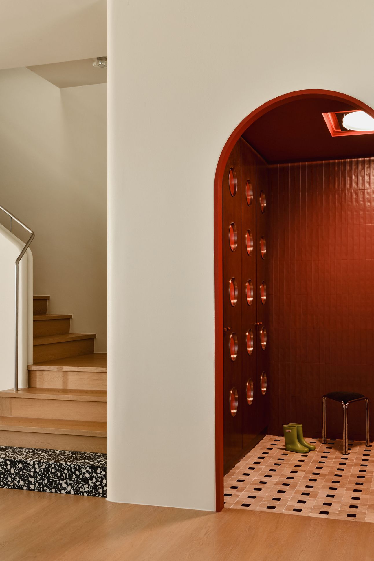 The entrance is fully saturated in lacquered red, creating a spatial pause that’s both intimate and unexpected. This concentrated moment of color sets the tone for the rest of the home, where palette and material take on an active role in shaping experience.