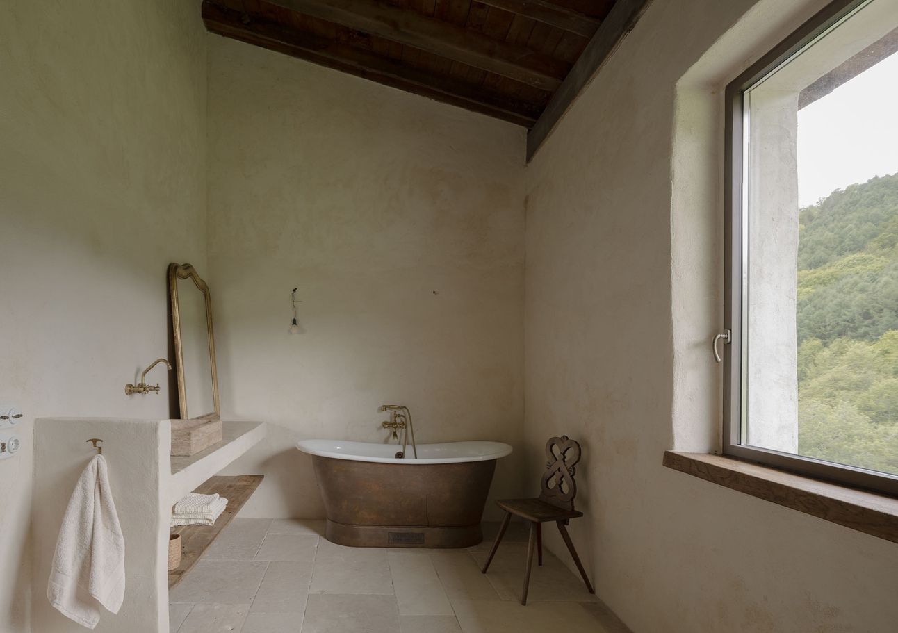 Every detail feels earned. The bronze tub, the imperfect stone sink, the handmade shelving—none of it is for show. There’s an honesty in the way light moves across the lime-plastered walls or how a single wooden chair anchors an empty corner. Almost avoid this idea of trying to impress and that’s what makes it beautiful.