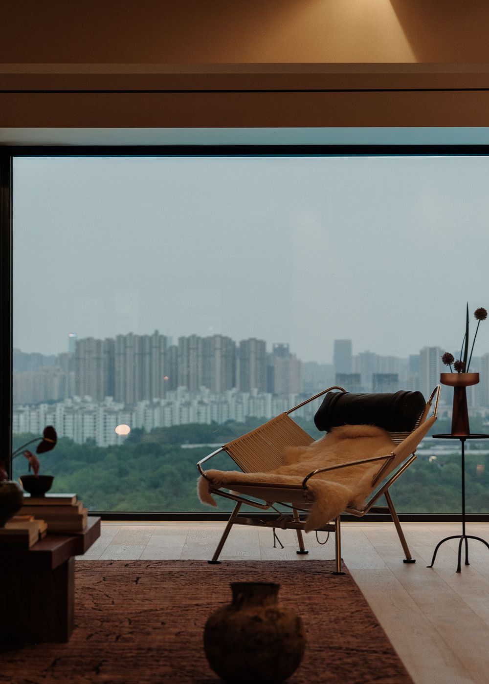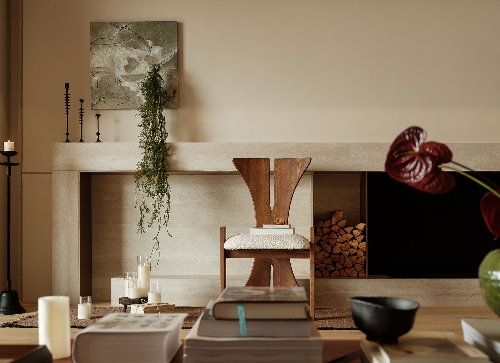 The fireplace wall highlights how simplicity can still hold drama. Pale stone frames a niche of firewood, while a chair with an exaggerated split-back design introduces sculptural tension. Candles and greenery break the stillness, balancing the hard surfaces with softness and life. The arrangement creates a setting that feels ceremonial yet lived-in, like a stage for both quiet rituals and warm gatherings.