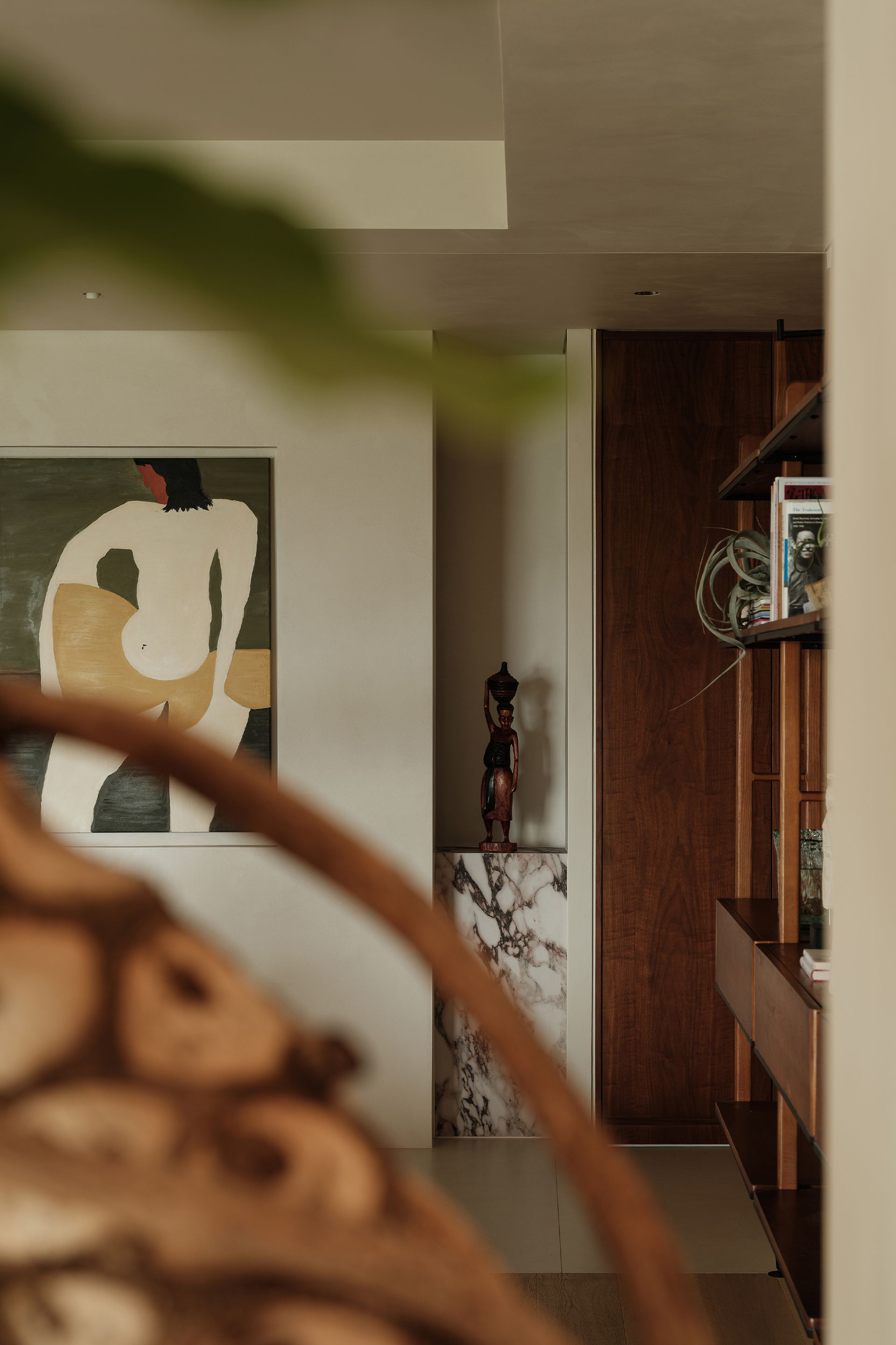 In the final vignette, art and artifact shape the atmosphere. A bold nude painting leans into modern expression, while a carved wooden figure rooted in tradition stands nearby, placed on a marble pedestal as if honoring ancestry. These juxtapositions tell a story larger than the room itself—of cultures meeting, histories overlapping, and identity layered across objects. The home becomes not just a place to live, but a mirror of memory, belonging, and curiosity.