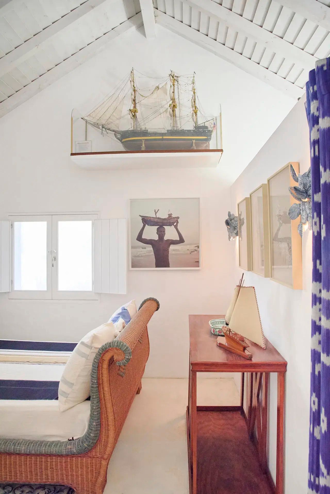 Inside the whitewashed boathouse, the design whispers of voyages and coastlines. A wicker sleigh bed curves like a ship’s hull, while miniature boats and maritime art line the walls in quiet tribute to Melides’ fishing past. The palette—navy, white, and terracotta—anchors the space in both sea and shore. Every detail here feels like a fragment of a story, waiting for you to lean in and listen.