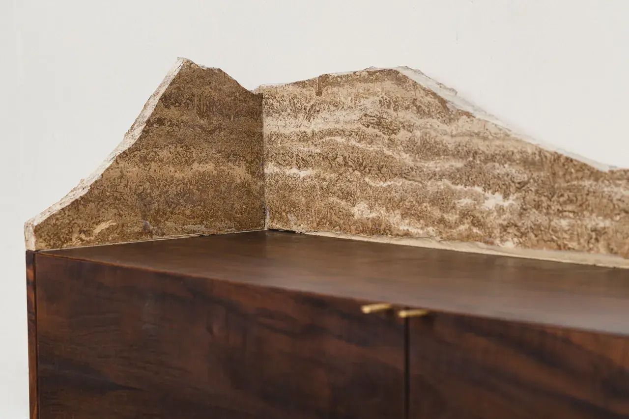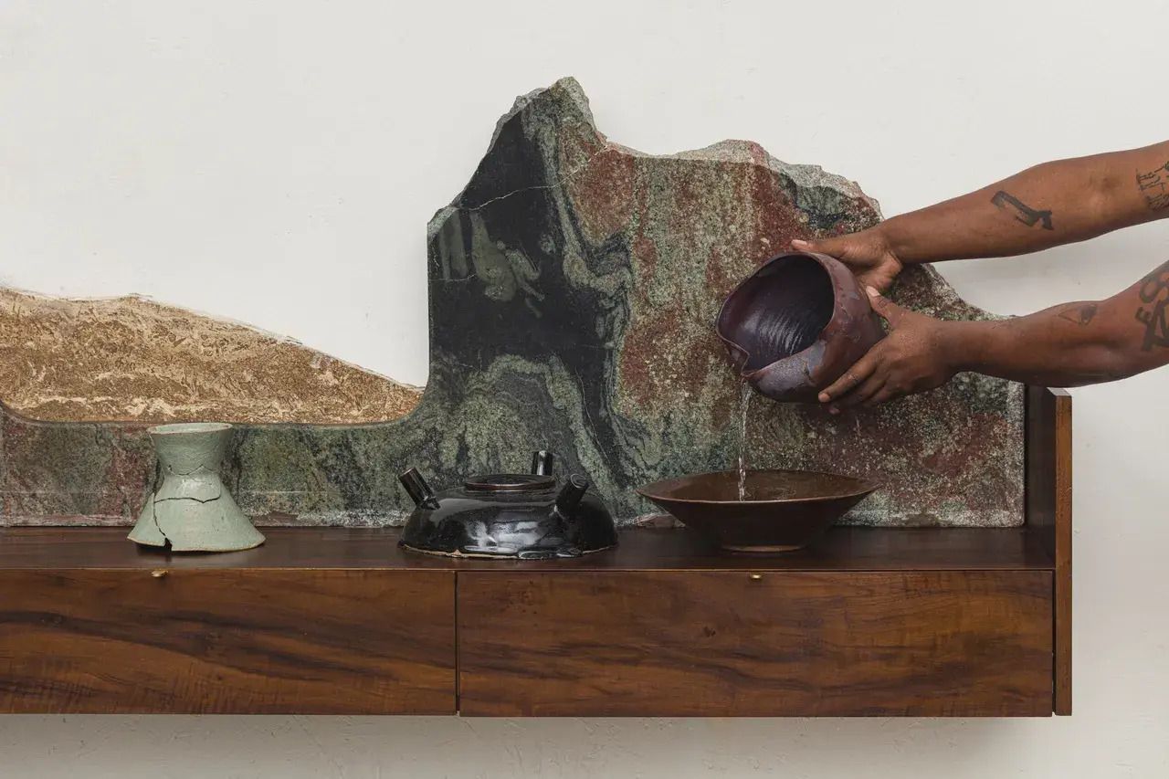 The piece feels like a collision between earth and ritual—a suspended altar that breathes through the raw tactility of wood and stone. The jagged marble backdrop, layered in red, green, and black veining, mimics a landscape in motion, a reminder of how nature itself is never still. Resting on the walnut base, vessels of clay and ceramic appear mid-ritual—water pouring, energy transferring, spirit invoked. Each mark and texture feels deliberate, as though the artist is rewriting memory through the act of making. What’s most striking is how the altar is both personal and collective—a quiet dialogue between ancestry, craft, and sacred labor.