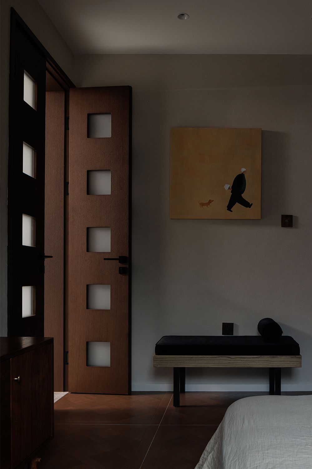 Every line in this home seems drawn to honor the mountains just beyond it. The square-cut openings of the wooden doors filter sunlight into quiet, rhythmic patterns—soft geometry against pale plaster walls. Art is used sparingly, like punctuation; a single painting, a black-cushioned bench, and the faint reflection of wood grain give the entryway the intimacy of a private retreat. Even the emptiness feels intentional—inviting stillness instead of spectacle.