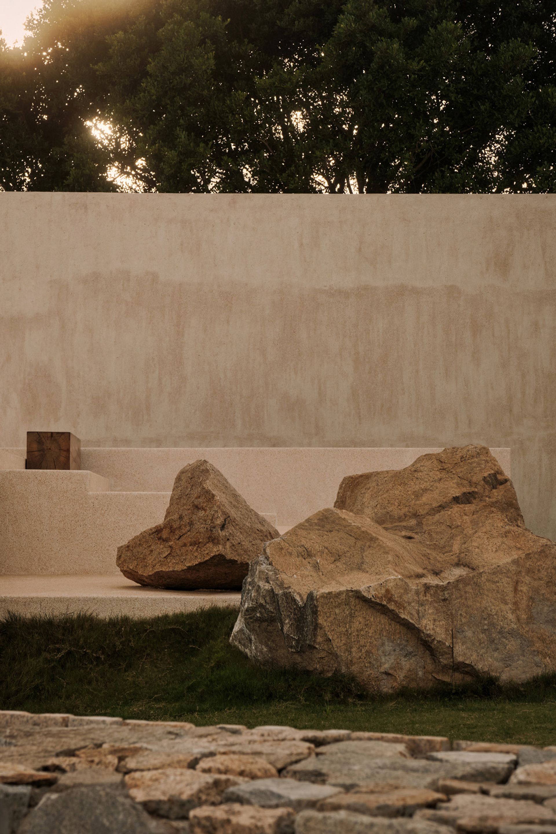 A wall punctuated by square voids faces the sea—each cutout a frame, each frame a horizon. Sunlight spills through in shifting patterns, tracing the passage of time like breath. The simplicity of the materials—just sand, stone, and air—belies the complexity of the feeling: a quiet longing to belong to something larger, to be both rooted and infinite all at once.