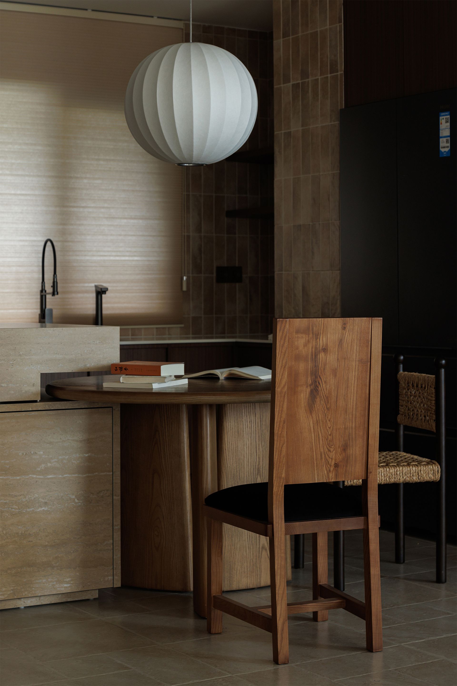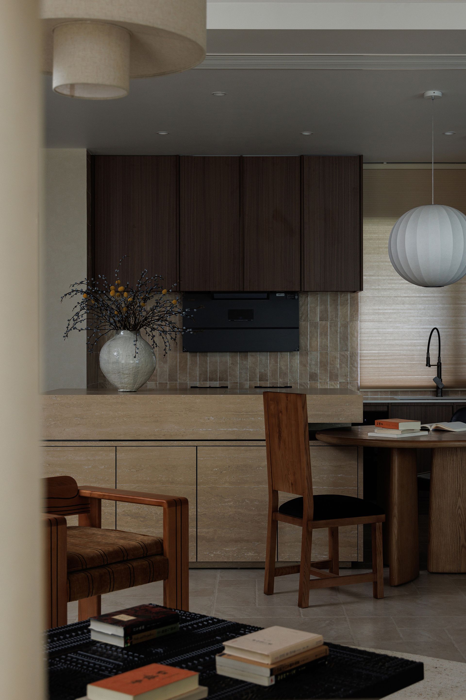 In the kitchen, travertine, walnut, and linen lampshades converge in soft conversation. The palette carries the warmth of the mountain soil, while the rounded table and low pendant lighting encourage slower gestures—morning coffee, reading, quiet exchange. There’s a studied tension between structure and softness: linear cabinetry grounded by hand-thrown ceramics and stacked books. The space moves gently, like a breath expanding through stone and wood.
