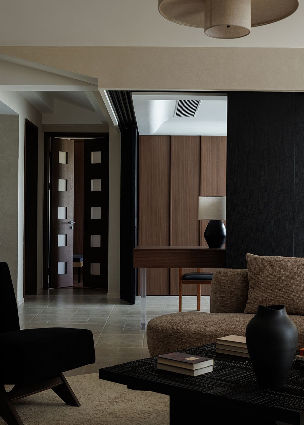 As the home unfolds, each threshold feels like a pause before an opening. Layers of tone—taupe, tobacco, graphite—create depth without relying on ornament. A living room framed in walnut panels and textured fabrics feels cocoon-like yet porous, its air animated by shifting shadow. This is architecture as rhythm: a choreography of material, proportion, and patience, where the mountain doesn’t simply sit outside the window—it enters the room through silence.
