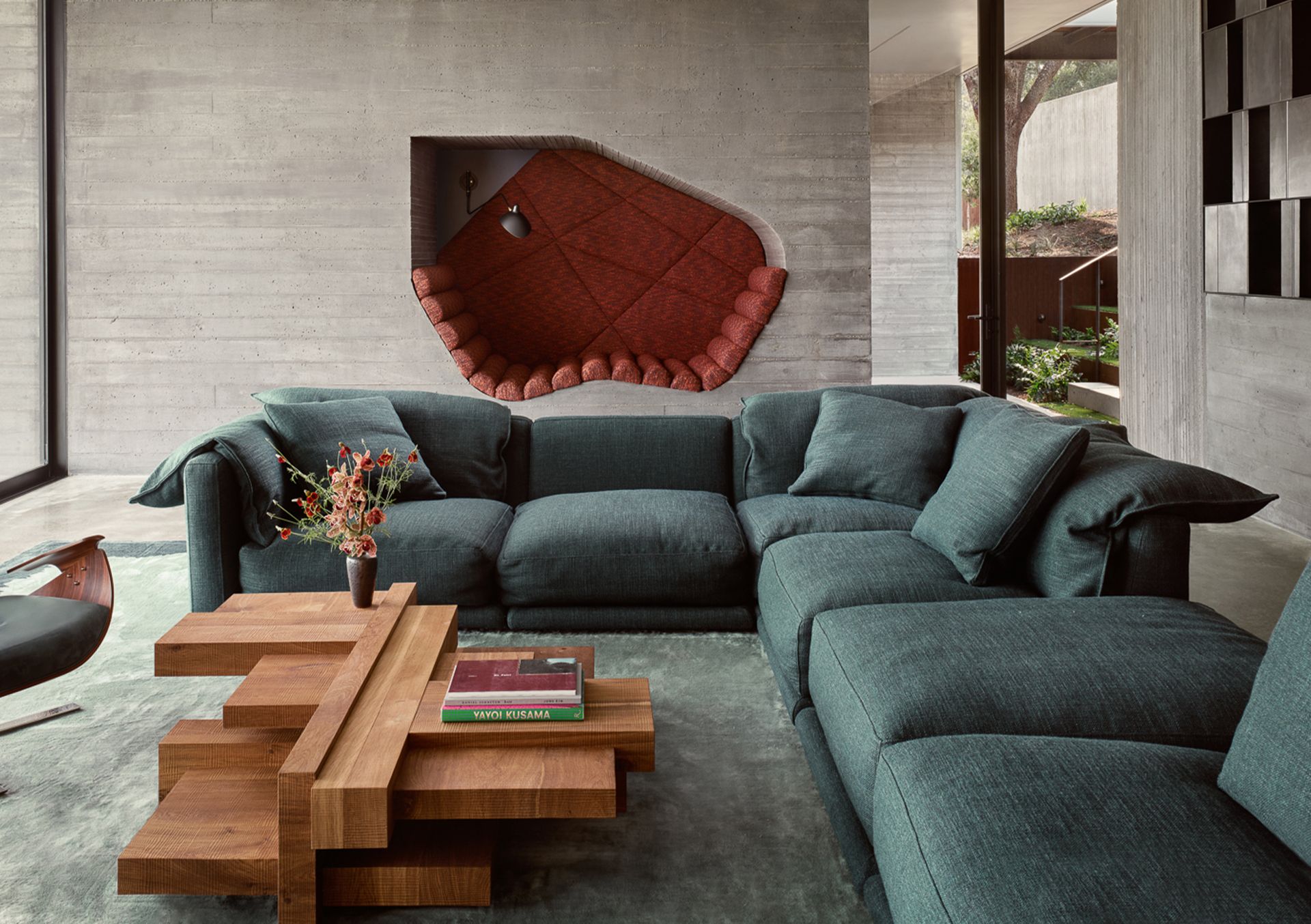 Inside, the structure trades grand gestures for spatial precision. Board-formed concrete walls hold a quiet texture, interrupted by a sculpted red alcove—a built-in reading nook folded into the architecture like an afterthought turned art form. The living area opens outward through floor-to-ceiling glazing, aligning views to the hillside and grounding the teal-toned upholstery against the warmth of the wood. Every surface seems to negotiate between weight and ease, permanence and softness.