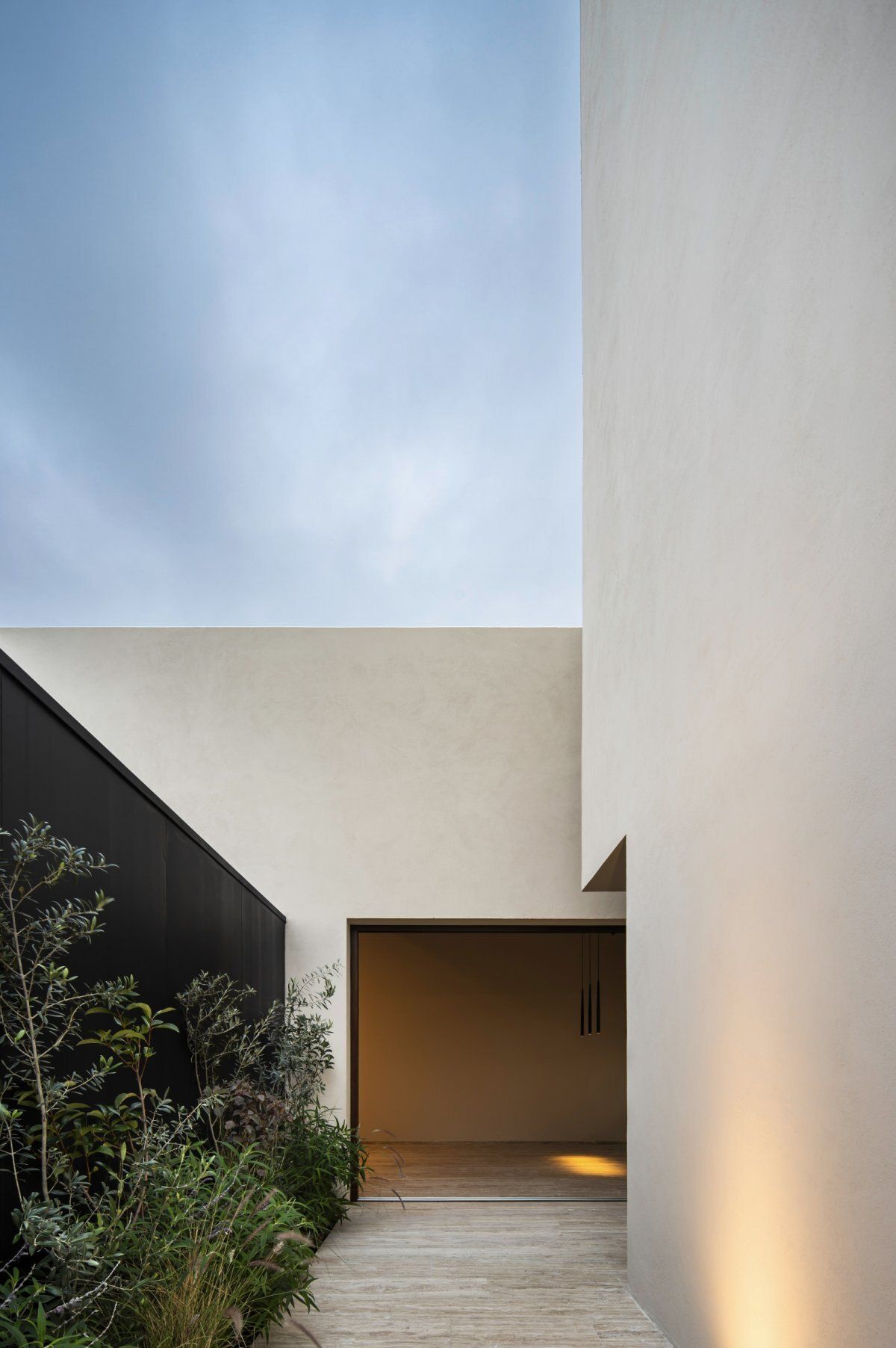 The courtyard feels like the home’s first breath — a quiet exhale between walls. Light folds softly across travertine as branches sketch fleeting patterns over pale plaster. Every element orbits the tree at its center; the walls don’t confine, they compose stillness. Even the bench, carved from a single piece of wood, invites pause rather than movement. The architecture lives not in its structure, but in the rhythm of air passing through it.