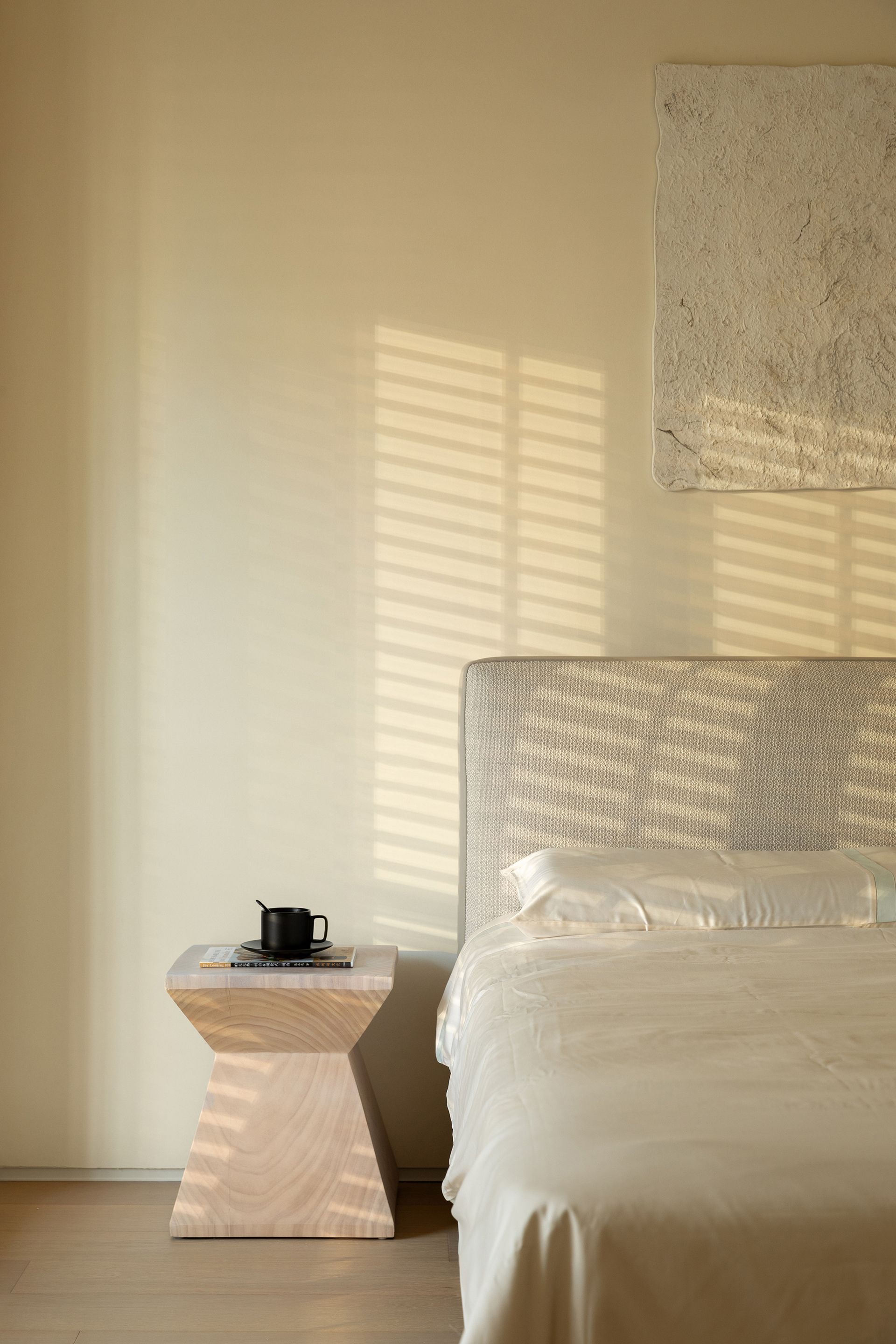 The walls hold the late-afternoon light in long ribbons, washing over the tactile grain of the side table and the soft weave of the headboard. Every element here feels considered but unperformed—a sanctuary that doesn’t rely on excess to feel whole. Even the shadows seem intentional, marking time gently across the room.
