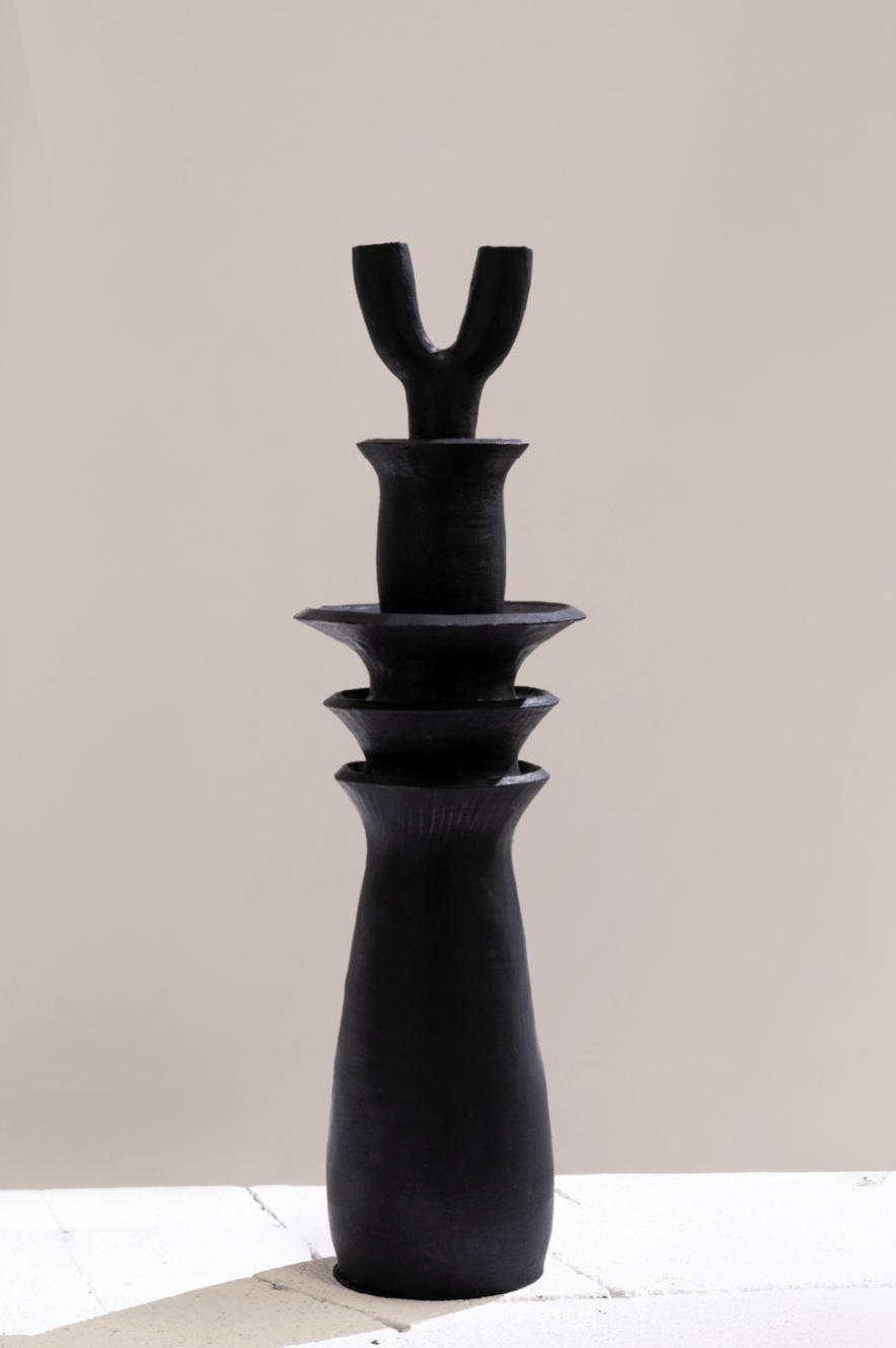 In contrast, Dina Nur Satti’s ceramics rise like quiet monuments—totemic, blackened forms that seem to listen more than speak. Their surfaces hold traces of hand and fire, echoing ancient rituals of making that tether craft to cosmology. Each vessel feels like an offering to continuity—part ritual object, part archive. The void between their ridges reads as breath, a space for lineage to pass through. Together, they remind that creation, in its truest form, is a form of remembering—an act of shaping silence into permanence.