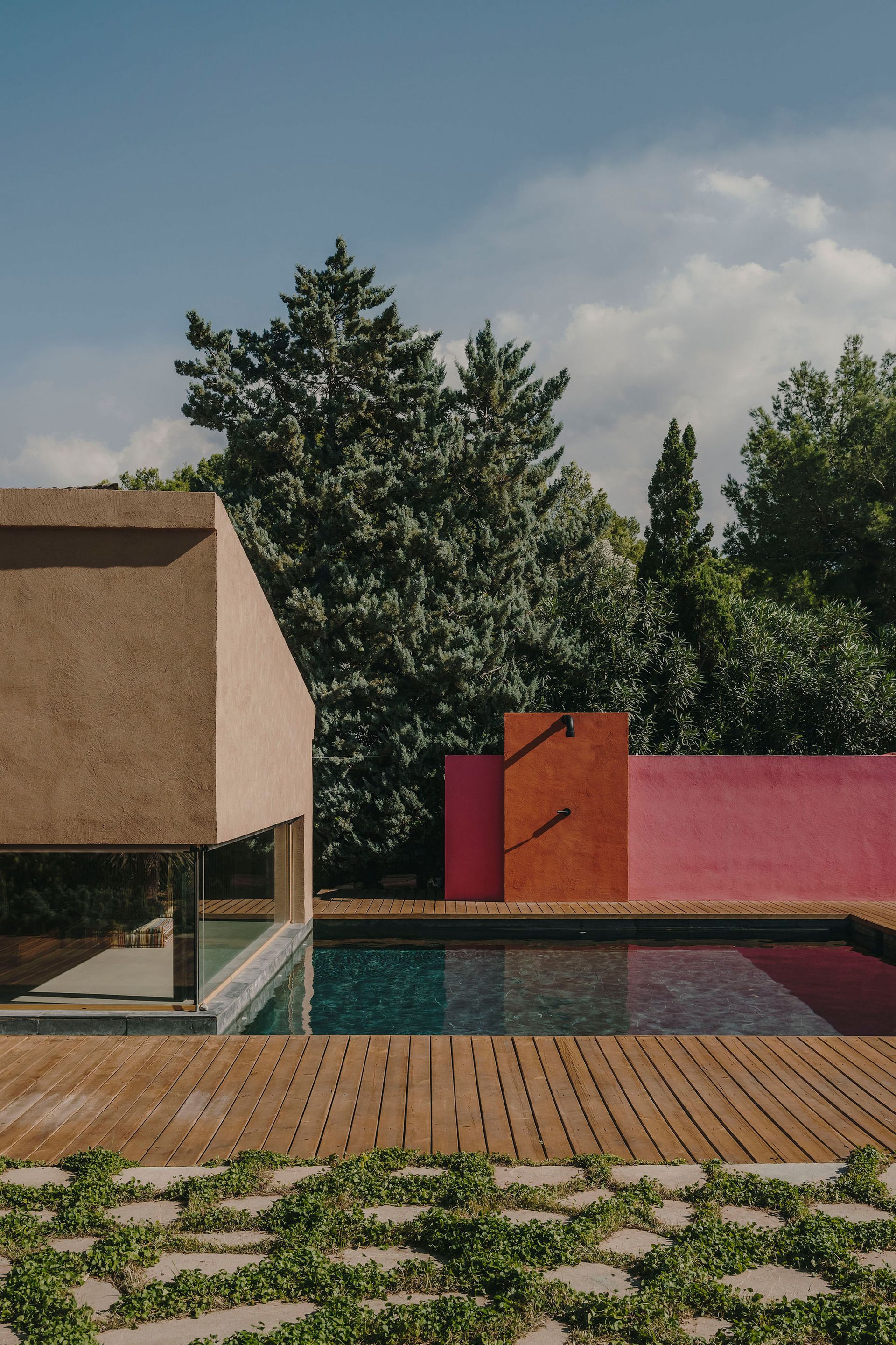 Clay plaster replaces hard white surfaces, giving walls a dry, mineral depth that absorbs light rather than reflecting it. Near the water, a muted pink wall doubles as an outdoor shower screen, balancing function with a quiet sense of presence. Timber decking sits flush with the pool edge, turning circulation into a place to pause. Every surface feels selected for how it ages.