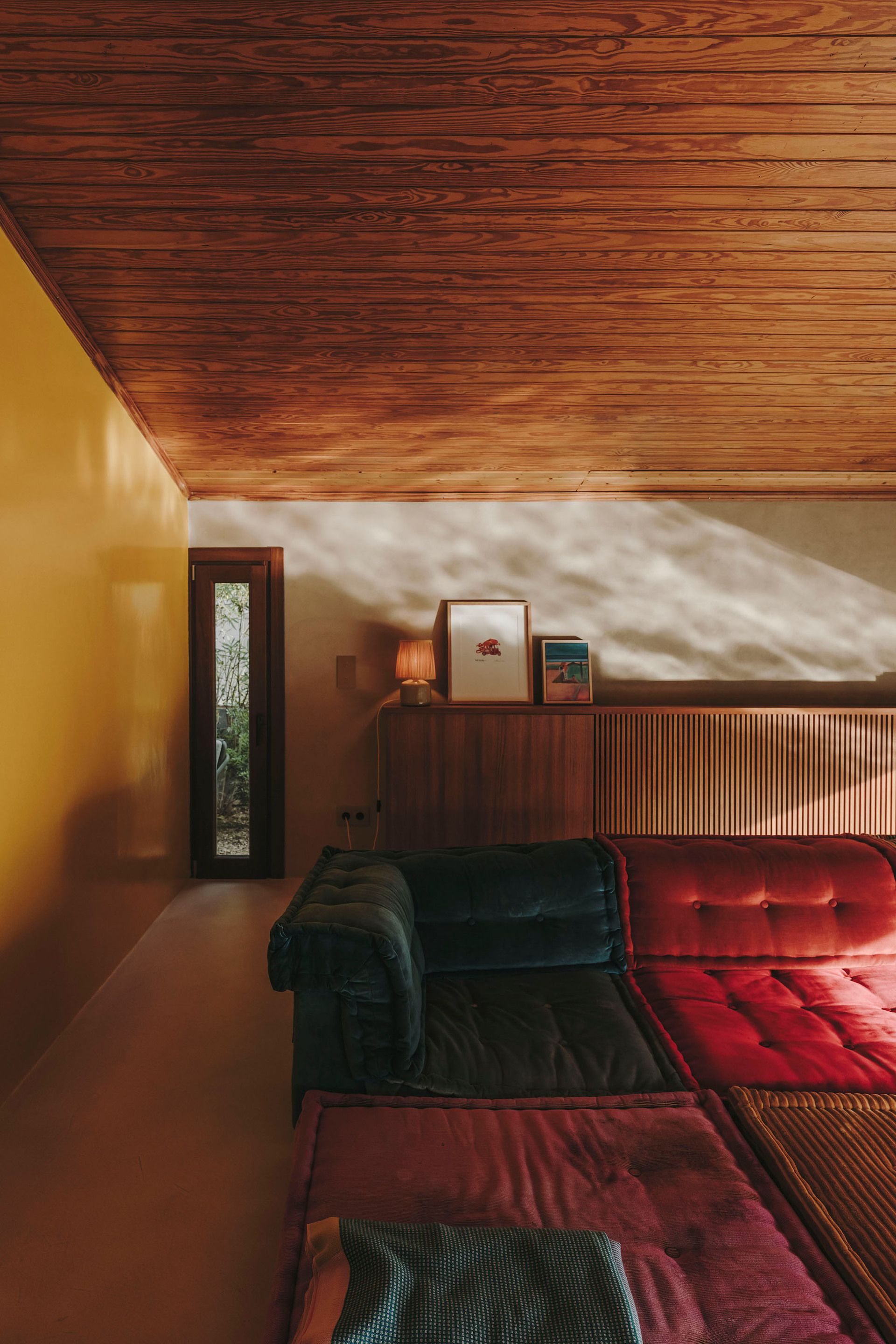 The space opens with a slanted ceiling lined in pine, running long and uninterrupted above the main living area. Light travels across the wood throughout the day, warming the room without relying on decoration. Built-in seating stays low and wide, keeping sight-lines clear and allowing the ceiling to remain the primary architectural move. The room feels steady and composed, shaped by structure more than objects.