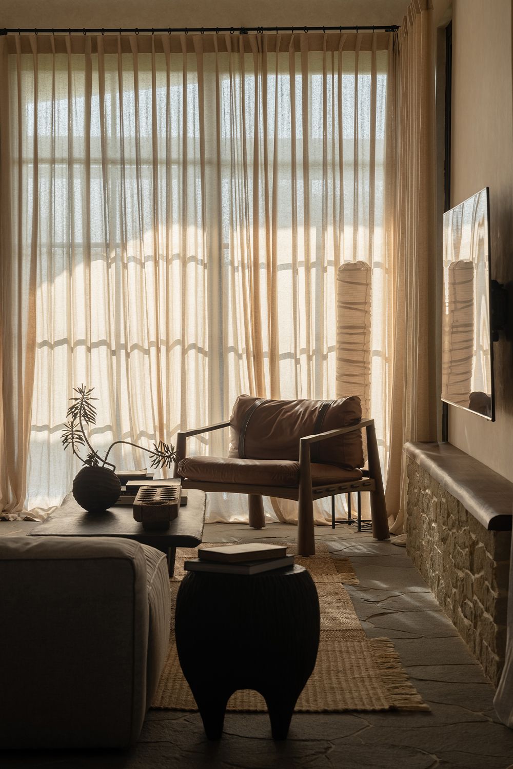 The living area softens everything—the edges, the light, even the way the room holds you. Sheer curtains run wall to wall, diffusing the outside into a muted gradient, while a low stone base wraps the perimeter like a continuous bench. The furniture sits low and weighted—thick wood arms, soft leather cushions—inviting stillness rather than movement. Light filters through in layers, catching on woven textiles and uneven surfaces, making the room feel less designed and more settled over time.
