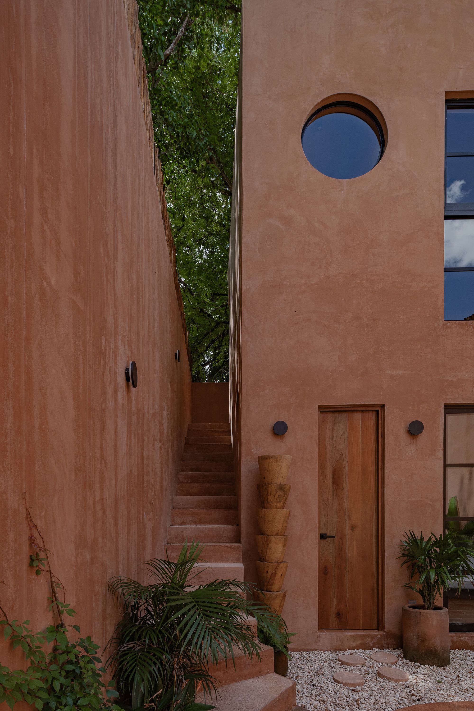 Two tall planes of pigmented concrete pulled tight, holding a narrow stair that rises toward a slice of sky. The walls carry a soft, uneven chukum finish, catching light in a way that feels almost weathered, almost ancient. A circular aperture punctures the façade, precise and quiet, while the wood door sits recessed, thick and weighty, like it belongs to the wall rather than attached to it. Even the sconces read as low, dark discs—everything deliberate.