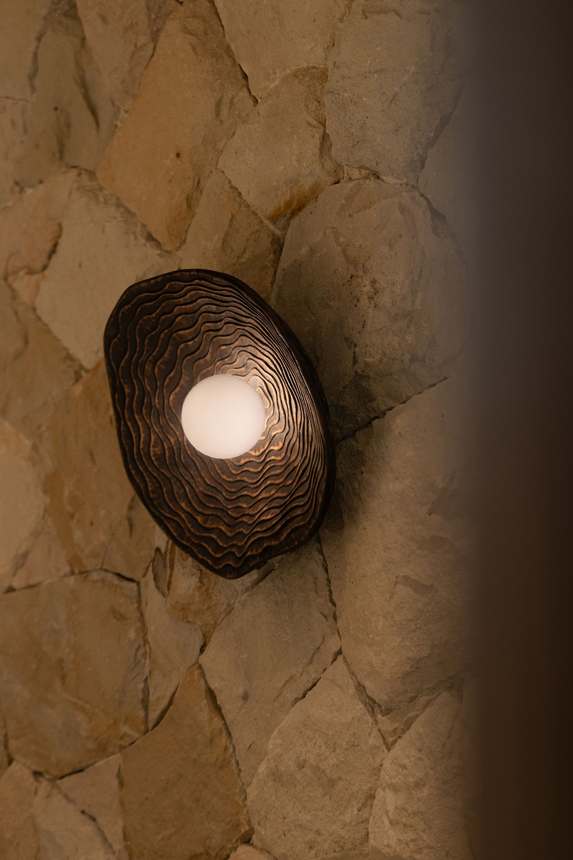 A narrow passage tightens the experience, where the architecture becomes more tactile, more intimate. The sink is carved from a single block, its underside left rough, almost broken, as if it was pulled directly from the ground and set in place. Above it, a small globe light hangs from a carved vertical mount—stacked, almost totemic—casting a soft, warm glow against plastered walls. The mirror stretches just enough to reflect the corridor behind, extending the space without expanding it.