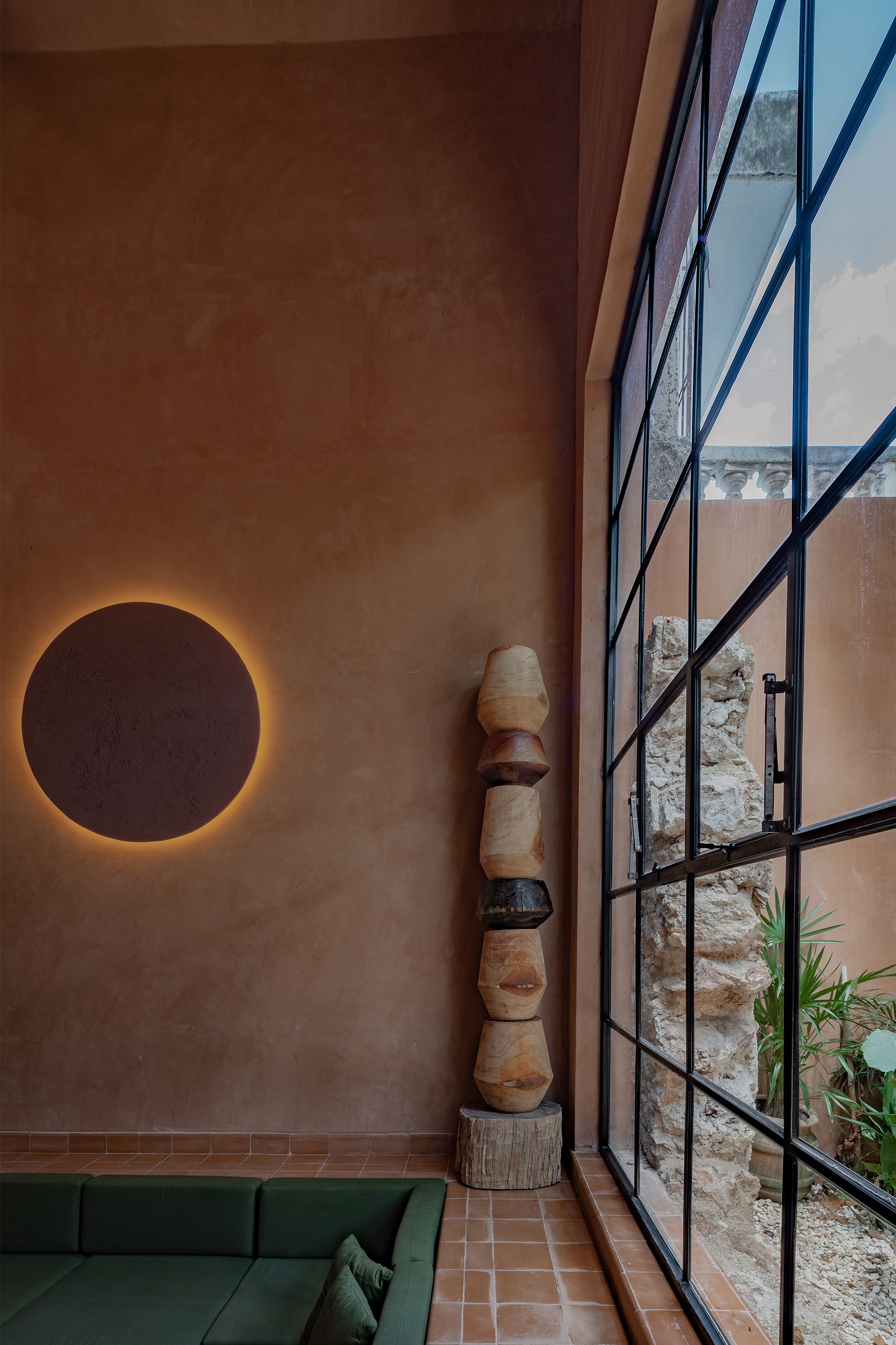 Inside, the scale shifts again—the ceiling lifts, the walls deepen in tone, and the space becomes quieter, more contained. A large steel-framed window stretches vertically, pulling in a fragment of the exterior—stone, greenery, light—like a living mural. The floor transitions to small-format terracotta tiles, grounding the room with a subtle grid that contrasts the softness of the plastered walls. In the corner, a stacked column of carved wood forms rises like a totem—part sculpture, part memory—anchoring the room without asking for attention.