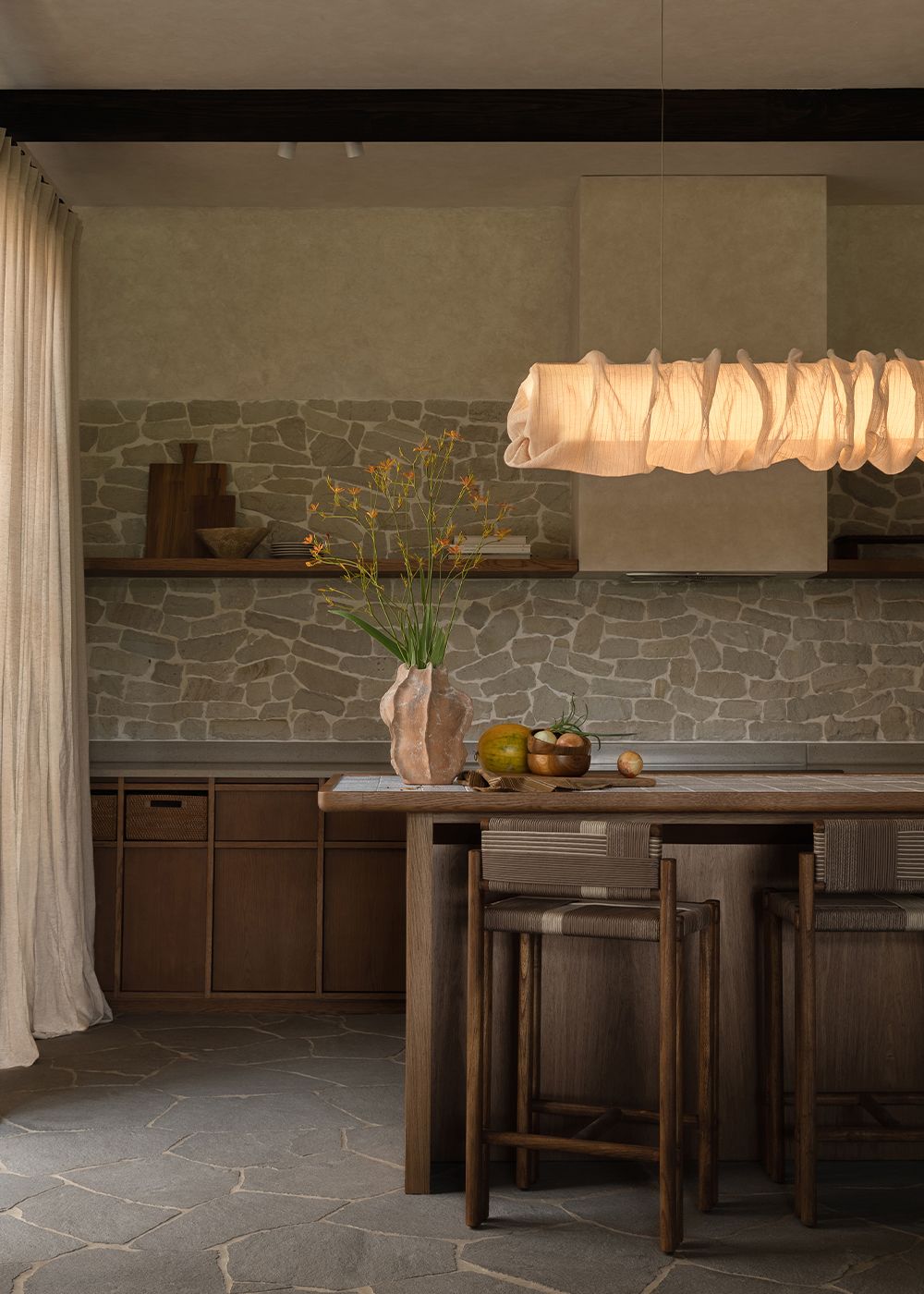 The space opens quietly—no thresholds, just a long timber table anchored beneath a suspended light that feels more like fabric than fixture. The stone wall behind it is irregular and hand-laid, each piece slightly off, holding a recessed ledge that doubles as both storage and display. Cabinetry sits low and continuous, finished in a deep wood tone that absorbs light rather than reflects it. Even the floor reads as fractured—large stone slabs with visible joints, grounding the room in something raw and deliberate.