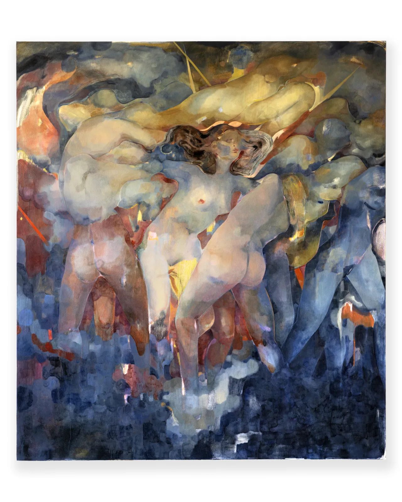 Eva Helene Pade builds a scene that feels unresolved, where bodies soften into clouds of pigment and the edges between figures begin to dissolve. Limbs bend and overlap with tension, creating diagonal movements across the canvas that read almost like structure rather than anatomy. Her brushwork shifts between dense, saturated strokes and areas that thin out and fade, making the image feel like it is still forming in real time. The result holds you in a fleeting moment where emotion, memory, and movement are all trying to settle but never fully do.
