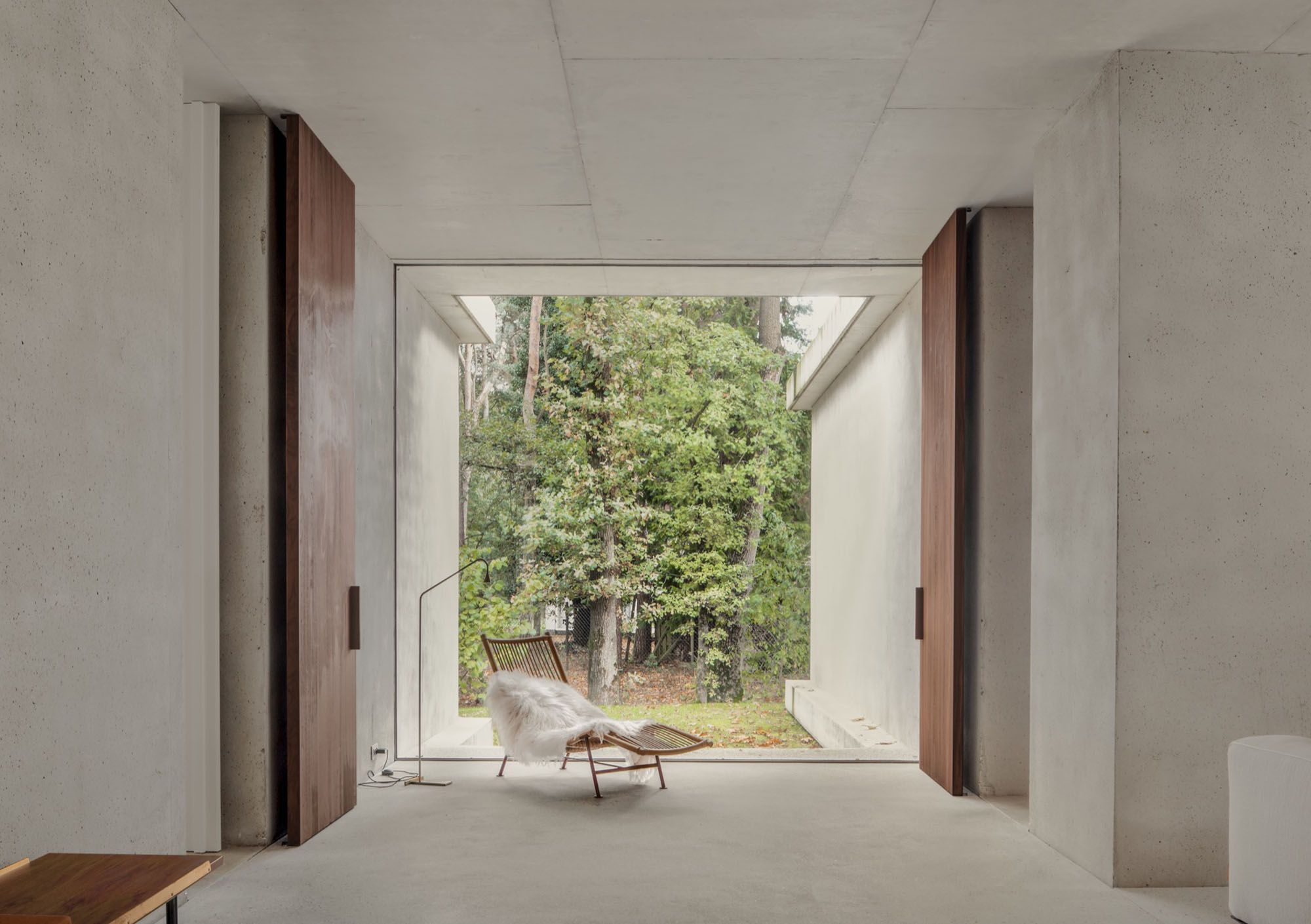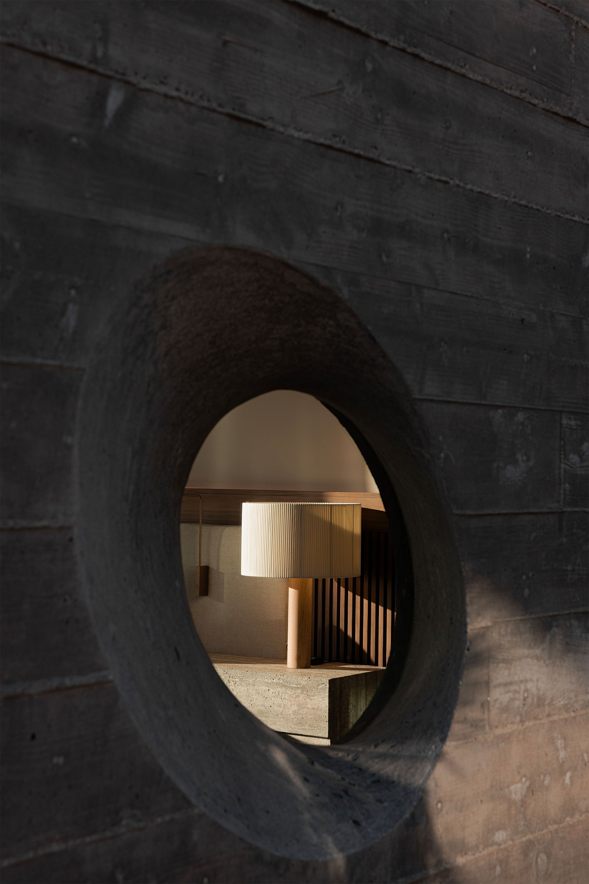 Here the room opens into a precise rectangular cut, framing the exterior like a living canvas. Concrete walls extend outward, creating a tunnel effect that draws the eye directly to the landscape beyond. A single lounge chair is positioned at the center, turning the act of sitting into a moment of observation rather than occupation. The architecture steps back here, allowing proportion, light, and framing to define the experience.
