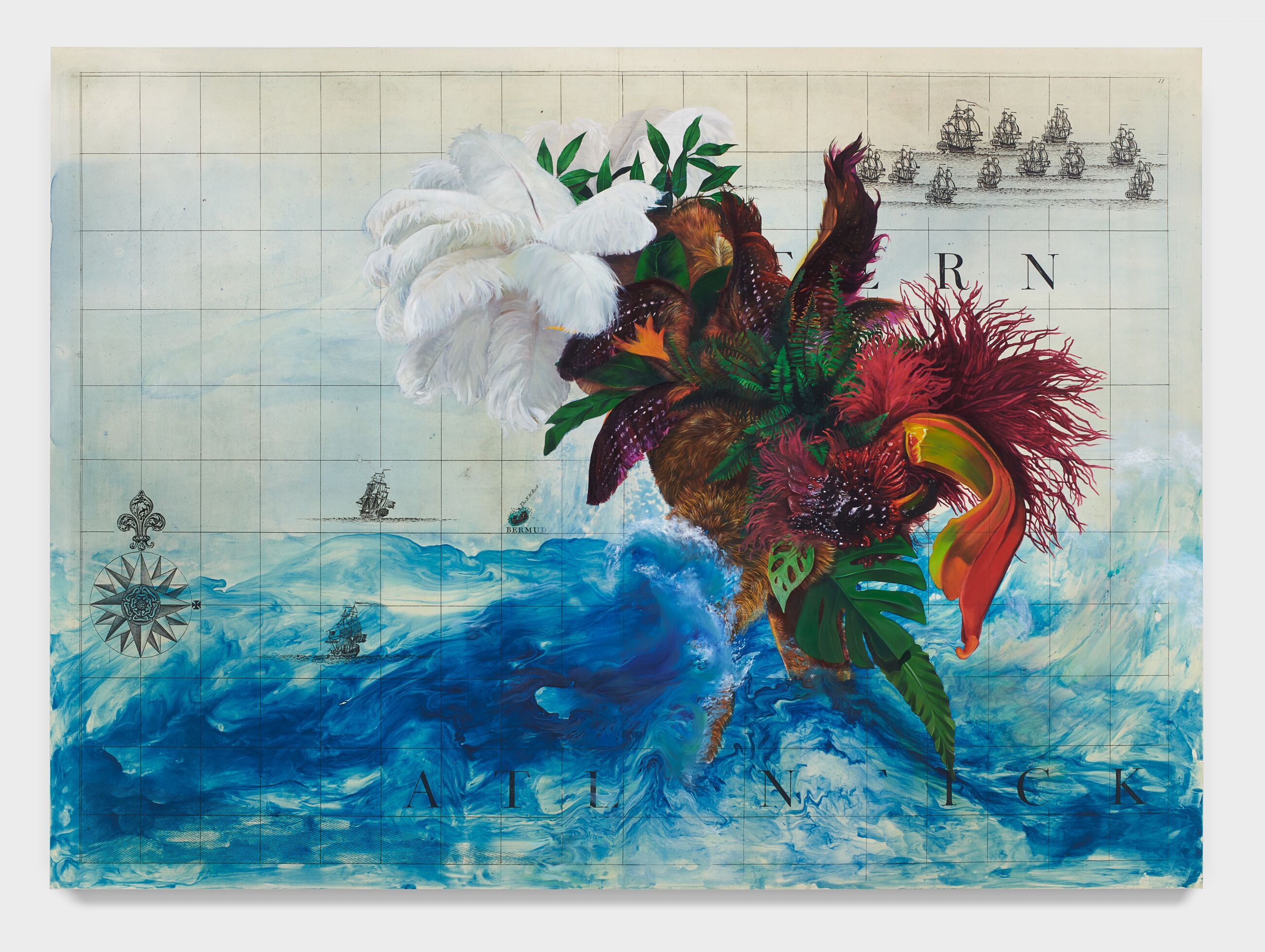 Firelei Báez works like she’s redrawing history from the margins, using pattern and scale to give presence back to figures that were flattened or erased. Her surfaces pull from the Caribbean, West Africa, and colonial archives at the same time, layering wallpaper motifs, maps, and symbols until they start to feel unstable.