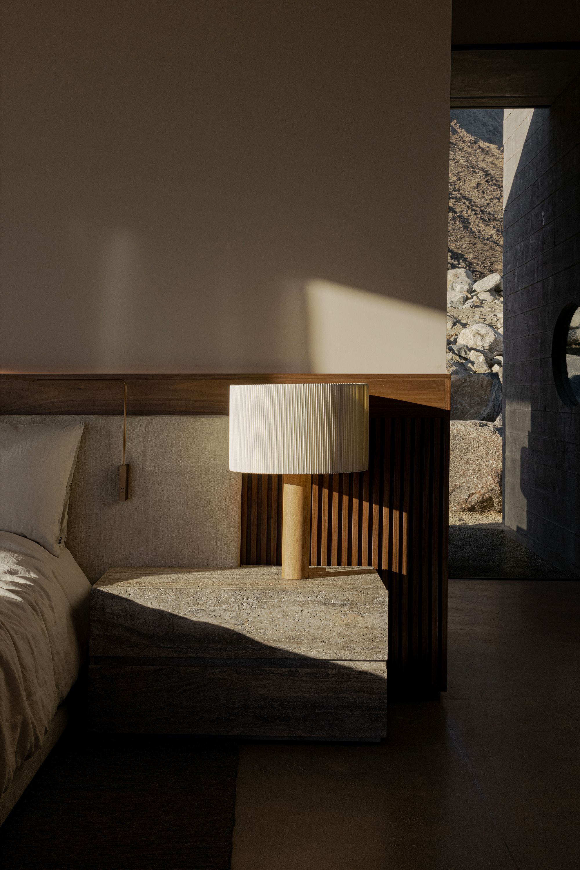 A monolithic travertine nightstand anchors the room, reading like a carved extension of the desert floor. A sharp cut of light moves across its surface, revealing pits, veins, and subtle tonal shifts that change throughout the day. Vertical wood slats sit behind it, adding warmth and a measured rhythm against the smooth linen headboard and pleated shade. The palette stays controlled, sand, warm oak, mineral beige, while contrast is built through form, solid mass against soft layers.