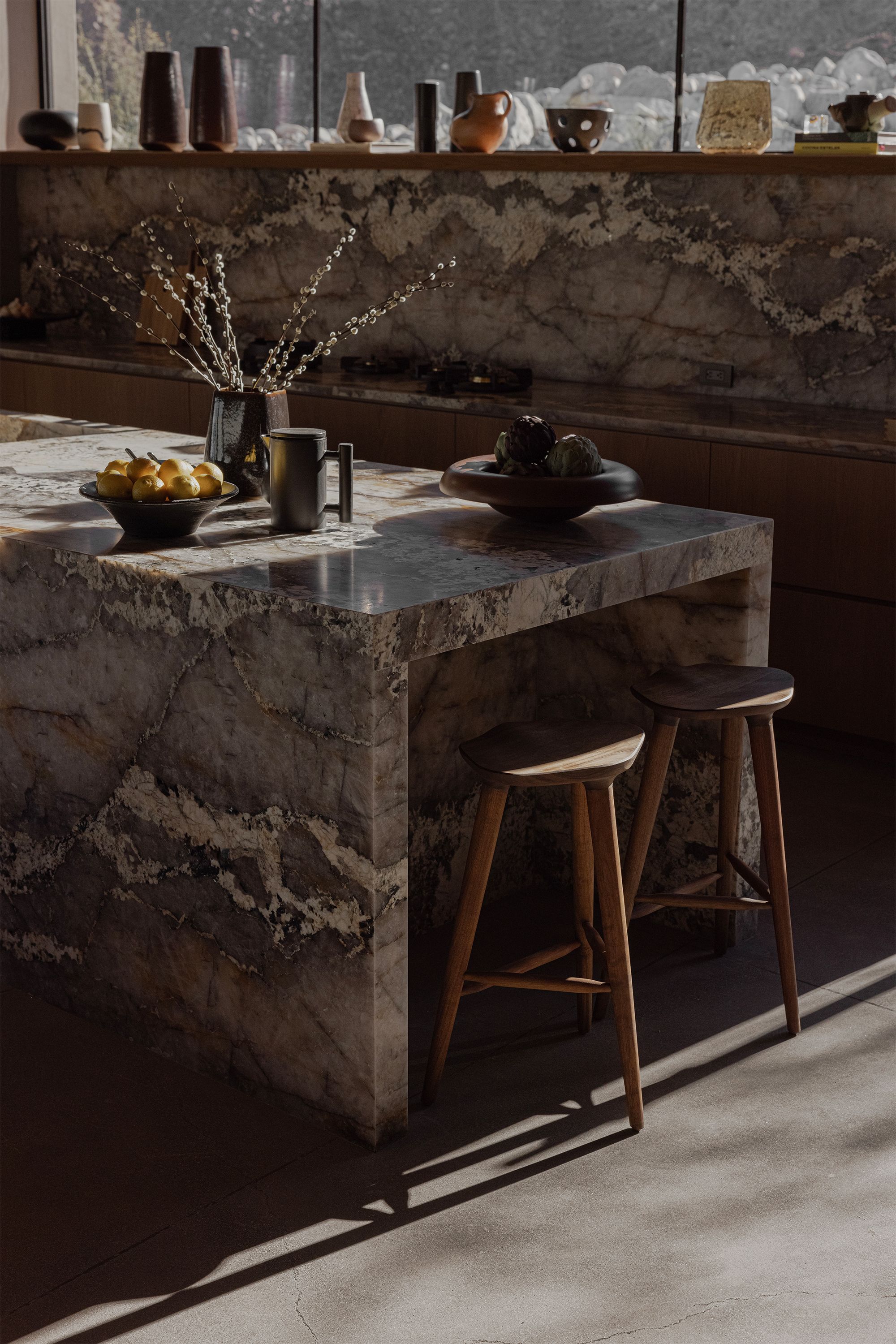 The kitchen island is treated as a singular volume, with veining that reads like sediment layers exposed over time. Its scale and density ground the space, while the surrounding cabinetry recedes into a quieter backdrop. Objects placed on top remain minimal, ceramic vessels, citrus, and matte finishes that reference handwork without excess. The stools, lightly framed in wood, maintain a low visual weight, allowing the stone to remain the focal point.