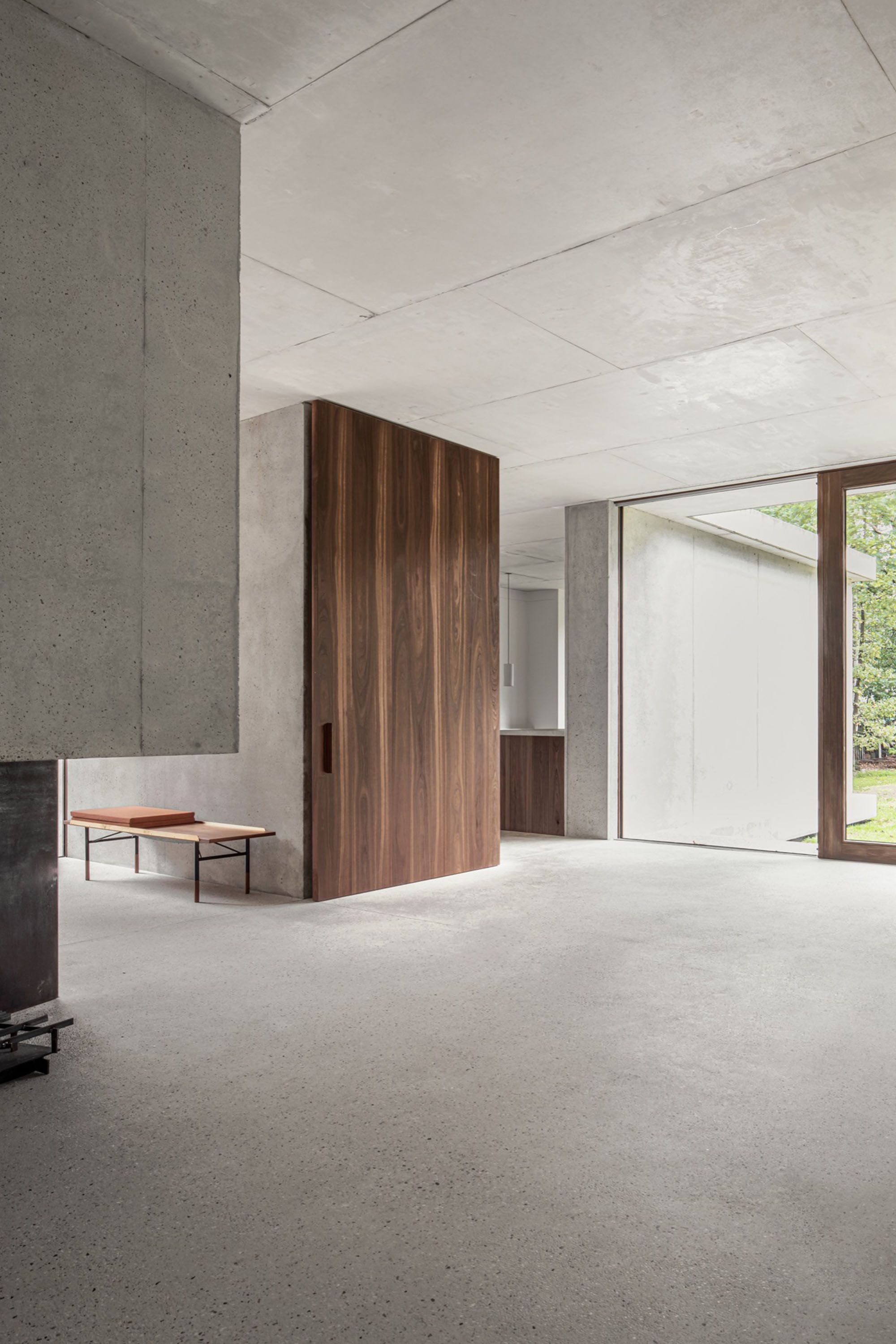 Circulation is not treated as leftover space but as something inhabitable, widened and held between concrete and full-height wood panels. A large pivoting wall in walnut acts as both door and divider, shifting how space is read depending on its position. The floor continues seamlessly in a fine, sanded finish, reinforcing a sense of continuity without thresholds. Light enters from multiple angles, flattening shadows and making the transitions between spaces feel slow and intentional.