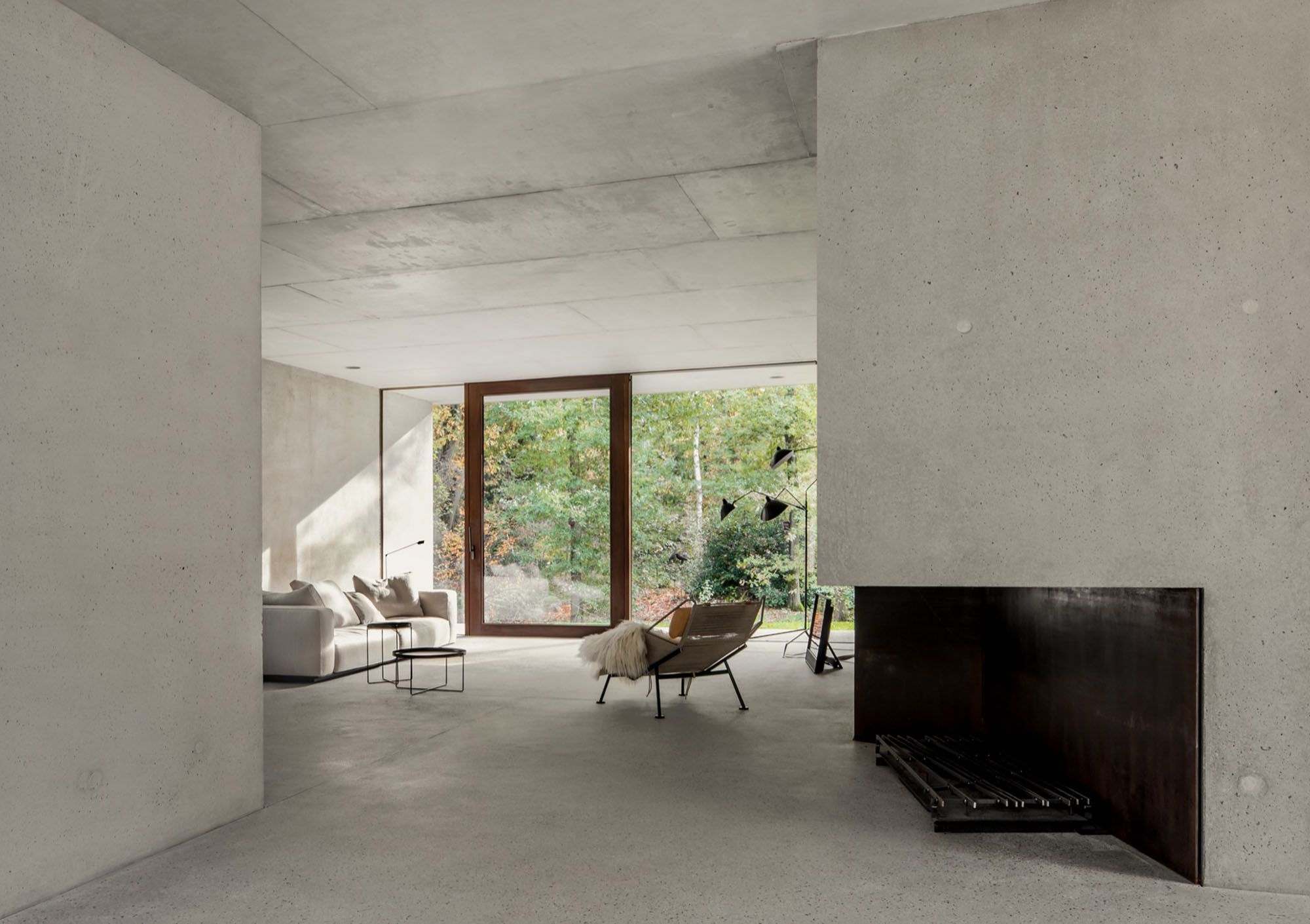 The space is defined by poured concrete that reads as both structure and finish, with ceiling slabs left exposed and uninterrupted. Columns are thick and slightly offset, creating moments of compression before the room opens toward a full-height glass wall. A suspended steel fireplace cuts into the volume, its dark patina introducing contrast against the pale, mineral surfaces. Furniture sits low and minimal, allowing the architecture to carry the weight of the room.